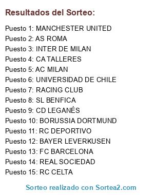 Lista de participantes: INTER DE MILAN, RC DEPORTIVO, CA TALLERES, UNIVERSIDAD DE CHILE, AC MILAN, AS ROMA, BORUSSIA DORTMUND, CD LEGANÉS, FC BARCELONA, RC CELTA, REAL SOCIEDAD, SL BENFICA, BAYER LEVERKUSEN, MANCHESTER UNITED, RACING CLUB.