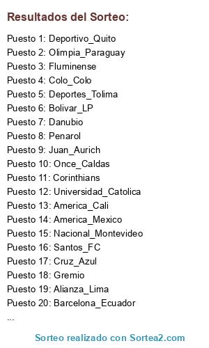 Lista de participantes: Atletico_Nacional_Medellin, Colo_Colo, Corinthians, Cruzeiro, Deportivo_Quito, Deportes_Tolima, Flamengo, Fluminense, Gremio, Inter_PA, Monterrey, Nacional_Montevideo, Olimpia_Paraguay, Penarol, Pumas_Unam, Santos_FC, Sao_Paulo, Sporting_Cristal, Universidad_Lima, Vasco_Da_Gama, Alianza_Lima, America_Cali, America_Mexico, Atletico_Mineiro, Barcelona_Ecuador, Bolivar_LP, Botafogo_FC, Cerro_Porteño, Cruz_Azul, Danubio, Deportivo_Tachira, Juan_Aurich, Los_Angeles_Galaxy, Libertad_Paraguay, Liga_Quito, New_York_Red_Bulls, Once_Caldas, Palmeiras, Universidad_Catolica, Universidad_Chile.