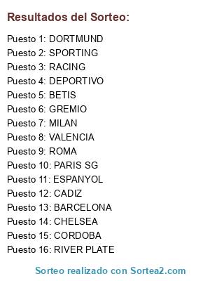Lista de participantes: CHELSEA, DORTMUND, DEPORTIVO, RACING, BETIS, GREMIO, MILAN, CORDOBA, CADIZ, VALENCIA, BARCELONA, ROMA, RIVER PLATE, SPORTING, PARIS SG, ESPANYOL.