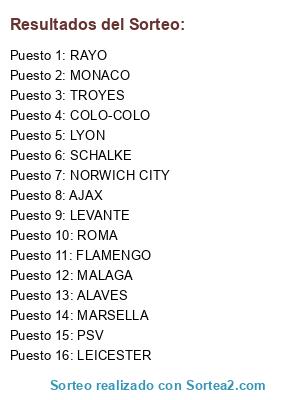 Lista de participantes: AJAX, ALAVES, COLO-COLO, FLAMENGO, LEICESTER, LYON, MALAGA, MARSELLA, MONACO, LEVANTE, NORWICH CITY, PSV, RAYO, ROMA, SCHALKE, TROYES.