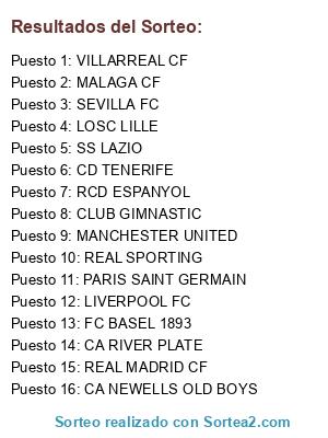 Lista de participantes: FC BASEL 1893, RCD ESPANYOL, CLUB GIMNASTIC, SS LAZIO, LOSC LILLE, LIVERPOOL FC, MALAGA CF, MANCHESTER UNITED, CA NEWELLS OLD BOYS, PARIS SAINT GERMAIN, REAL MADRID CF, CA RIVER PLATE, SEVILLA FC, REAL SPORTING, CD TENERIFE, VILLARREAL CF.