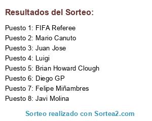 Lista de participantes: Luigi, FIFA Referee, Juan Jose, Javi Molina, Mario Canuto, Diego GP, Felipe Miñambres, Brian Howard Clough.