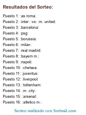 Lista de participantes: :inter: :vs: :m. united:, :barcelona:, :bayern m.:, :juventus:, :m. city:, :psg:, :real madrid:, :as roma:, :tottenham:, :arsenal:, :borussia:, :chelsea:, :atletico m.:, :liverpool:, :milan:, :napoli:.