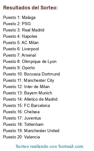 Lista de participantes: FC Barcelona, Real Madrid, Manchester United, Manchester City, AC Milan, Bayern Munich, Chelsea, Inter de Milan, Arsenal, Juventus, Liverpool, Napoles, Borussia Dortmund, Valencia, Atletico de Madrid, Olimpique de Lyon, PSG, Malaga, Oporto, Tottenham.