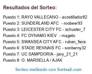 Lista de participantes: FC DYNAMO KIEV (10º) - mageto (11º), STADE RENNAIS FC (7º) - sonberny32 (9º), RAYO VALLECANO (6º) - acostillador82 (6º), O. MARSELLA / AJAX, LEICESTER CITY FC (4º) - schuster_7 (4º), SWANSEA CITY AFC (3º)- ruben_fiera (2º), SUNDERLAND AFC (2º) - roobeer93 (4º), UC SAMPDORIA (1º) - javy_21_21 (1º).