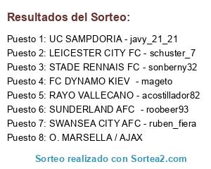 Lista de participantes: FC DYNAMO KIEV - mageto, STADE RENNAIS FC - sonberny32, RAYO VALLECANO - acostillador82, O. MARSELLA / AJAX, LEICESTER CITY FC - schuster_7, SWANSEA CITY AFC - ruben_fiera, SUNDERLAND AFC - roobeer93, UC SAMPDORIA - javy_21_21.