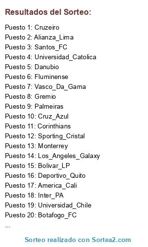 Lista de participantes: Atletico_Nacional_Medellin, Colo_Colo, Corinthians, Cruzeiro, Deportivo_Quito, Deportes_Tolima, Flamengo, Fluminense, Gremio, Inter_PA, Monterrey, Nacional_Montevideo, Olimpia_Paraguay, Penarol, Pumas_Unam, Santos_FC, Sao_Paulo, Sporting_Cristal, Universidad_Lima, Vasco_Da_Gama, Alianza_Lima, America_Cali, America_Mexico, Atletico_Mineiro, Barcelona_Ecuador, Bolivar_LP, Botafogo_FC, Cerro_Porteño, Cruz_Azul, Danubio, Deportivo_Tachira, Juan_Aurich, Los_Angeles_Galaxy, Libertad_Paraguay, Liga_Quito, New_York_Red_Bulls, Once_Caldas, Palmeiras, Universidad_Catolica, Universidad_Chile.