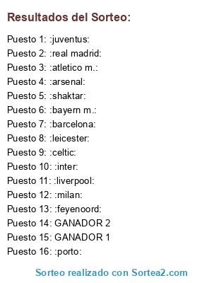 Lista de participantes: :barcelona:, :bayern m.:, :juventus:, :real madrid:, :arsenal:, :atletico m.:, :celtic:, :inter:, :liverpool:, :milan:, :porto:, :feyenoord:, :leicester:, :shaktar:, GANADOR 1, GANADOR 2.