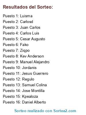 Lista de participantes: Regulo, Ziqpo, Kpealoza, Carlos Luis, Carlosd, Luisma, Manuel Alejandro, Jesus Guerrero, Samuel Colina, Cesar Augusto, Juan Carlos, Fako, Jose Montilla, Daniel Alberto, Kev Anderson, Jordanis.