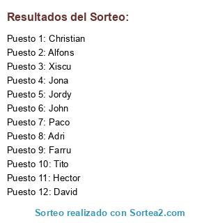 Lista de participantes: David, Xiscu, Hector, Farru, Paco, Alfons, Tito, Jona, Christian, John, Jordy, Adri.