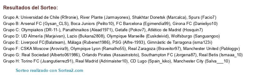 Lista de participantes: Real Madrid (Adrimaister10), Panathinaikos (Alead1971), Real Zaragoza (Braveitor97), Southampton FC (Jorgena87), Gimnàstic de Tarragona (isma123i), FC Barcelona (Egimendia99), UD Almería (Marjaivan), Wolfsburgo (Sanguangoo), Shakhtar Donetsk (Marcalca), Torino FC (Juangutierrez91), Atlético de Madrid (Hosquin7), Real Sociedad (Alberto061986), Olympique Marseille (Euskdeivid), CSKA Moscow (Arovira9), Orlando Pirates (Assasinstoto), Lazio (Bukana2808), River Plante (Jarmayones), Olympique Lyon (Ramalho55), Olympiakos (DR-11-), Boca Juniors (Pelito10), Getafe (Pokov7), Manchester United (Pabloggv), Universidad de Chile (R9ronie), Manchester City (Salva___10), Liverpool FC(Balateam), Girona FC (Danieliyo10), CD Lugo (Spain_kiko), Málaga (Rubenet1986), Arsenal FC (Gysan_CLS), Spurs (Facio7), Real Betis (Ismaaa_10), PSG (Alfre-1993).