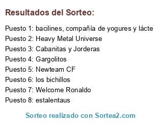 Lista de participantes: bacilines, compañía de yogures y lácteos, Welcome Ronaldo, los bichillos, Gargolitos, estalentaus, Cabanitas y Jorderas, Heavy Metal Universe, Newteam CF.