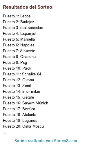 Lista de participantes: Milan, Albacete, FC Barcelona, Arsenal, Lecce, Borussia Dortmund, Paok, Bayern Múnich, Cska Moscu, Castellón, Villarreal, Psv, Getafe, Tottenham, Fuenlabrada, Sampdoria, Sheifield United, Atlético Madrid, Almeria, Lugo, Young Boys, Atalanta, Lazio, Extremadura, Schalke 04, Oporto, Granada, Benfica, Ajax, Real murcia, Espanyol, Osasuna, Girona, Badajoz, Marsella, Napoles, Levante, Malaga, Alabes, Chelsea, Celta, Leicester, Zenit, Juventus, liverpool, monaco, real sociedad, roma, fiorentina, real Madrid, Psg, Valencia, inter milan, Sevilla, leverkusen, Leganés.