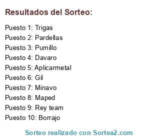 Lista de participantes: Davaro, Aplicarmetal, Pumillo, Borrajo, Pardellas, Gil, Maped, Minavo, Trigas, Rey team.
