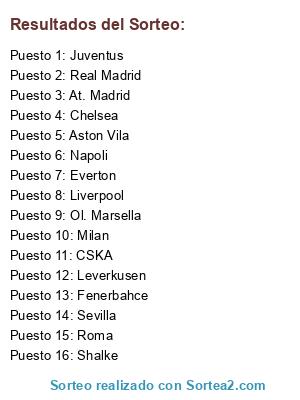 Lista de participantes: Everton, Shalke, Ol. Marsella, Real Madrid, Roma, Fenerbahce, Aston Vila, Sevilla, Juventus, Napoli, Chelsea, Milan, CSKA, Liverpool, At. Madrid, Leverkusen.