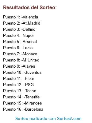 Lista de participantes: -Arsenal, -Juventus, -Alaves, -Tenerife, -PSG, -Lazio, -Valencia, -Barcelona, -Monaco, -Napoli, -Eibar, -Mirandes, -At.Madrid, -Torino, -Delfino, -M.United.