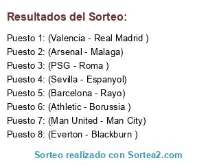 Lista de participantes: (Everton - Blackburn ), (Arsenal - Malaga), (Athletic - Borussia ), (Sevilla - Espanyol), (Valencia - Real Madrid ), (PSG - Roma ), (Barcelona - Rayo), (Man United - Man City).