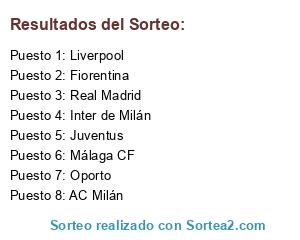 Lista de participantes: Oporto, Fiorentina, Málaga CF, Inter de Milán, Real Madrid, Liverpool, AC Milán, Atlético de Madrid, Parma, Juventus.