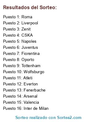 Lista de participantes: Atleti, CSKA, Napoles, Fiorentina, Arsenal, Liverpool, Valencia, Fenerbache, Wolfsburgo, Everton, Zenit, Juventus, Roma, Tottenham, Inter de Milan, Oporto.