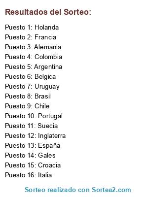 Lista de participantes: Holanda, Portugal, Inglaterra, Colombia, Croacia, Chile, Suecia, Gales, Argentina, Alemania, Brasil, Belgica, España, Uruguay, Italia, Francia.