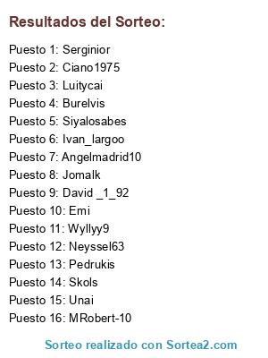 Lista de participantes: David _1_92, Jomalk, Siyalosabes, Serginior, MRobert-10, Unai, Ciano1975, Neyssel63, Burelvis, Pedrukis, Angelmadrid10, Skols, Ivan_largoo, Emi, Luitycai, Wyllyy9.