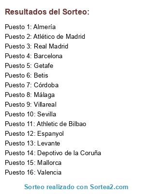 Lista de participantes: Valencia, Villareal, Sevilla, Málaga, Barcelona, Athletic de Bilbao, Betis, Getafe, Real Madrid, Levante, Atlético de Madrid, Espanyol, Almería, Mallorca, Córdoba, Depotivo de la Coruña.