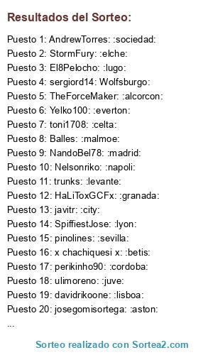 Lista de participantes: Adriantr127: :atmadrid:, adrylito: :malaga:, alead71: :tottenham:, alemalaga94: :bayern:, Alex1493: :hamburgo:, alexfcbarcelona: :dortmund:, AlexvsF1: :Norwich:, AndrewTorres: :sociedad:, Balles: :malmoe:, benniscuba: :roma:, buijin: :celtic:, CometHeaven79: :chelsea:, cudeiro: :bilbao:, DaniBke: New York City, danygp89: :bour:, davidrikoone: :lisboa:, El8Pelocho: :lugo:, Ergion46: :monaco:, ferminnn: :nantes:, Goss83: :schalke:, haankko888: :galaxy:, HaLiToxGCFx: :granada:, Havel7: :psg:, iGosling v9: :arsenal:, iSugar v11: B. Moenchegladbad, Ivanxio: :sounders:, javitr: :city:, josegomisortega: :aston:, KaOs I AsTuR: :oviedo:, lorenbb: :marsella:, Luispro0103: :river:, merayombasogo: :ponfe:, misterserpico: :ham:, Mori1983: :fiore:, MrMohamRam: :liverpool:, n0jan: :cristal:, NandoBel78: :madrid:, Nelsonriko: :napoli:, pececillo1977: :ajax:, perikinho90: :cordoba:, pinolines: :sevilla:, Platero17: :oporto:, Red Dutti: :leverkusen:, Rokitys: :cska:, Saavexbox: :palmas:, Semmenup: :orlando:, sergiord14: Wolfsburgo:, sergiotabascos89: :united:, SpiffiestJose: :lyon:, SrPistolas86: :udinese:, StormFury: :elche:, susa16: :alaves:, tabascos89: :barca:, TATO XD: :depor:, TheForceMaker: :alcorcon:, toni1708: :celta:, trunks: :levante:, ulimoreno: :juve:, victub: :valencia:, Viya88: :rayo:, x chachiquesi x: :betis:, xSAMU: :benfica:, Yelko100: :everton:, zzzz jona zzzz: :boca:.