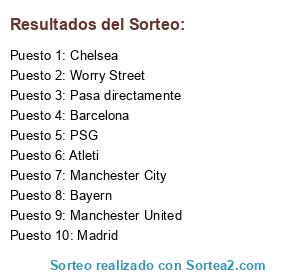 Lista de participantes: Barcelona, Madrid, Atleti, Chelsea, Manchester United, Manchester City, Worry Street, PSG, Bayern, Pasa directamente.