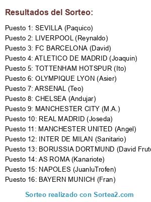 Lista de participantes: JUVENTUS (El2ya), PSG (Super), VALENCIA CF (Julio), MANCHESTER CITY (M.A.), OPORTO (kong), SPORTING LISBOA (Brasi), AC MILAN (Kristian), REAL BETIS (ElSalchichas), ATHLETIC BILBAO (ElGlorioso), WEST HAM UNITED (Manu), EVERTON (Cristofer), RB LEIPZIG (Antonio Luis), BAYERN LEVERKUSEN (Juanma), AS MONACO FC (Eloy), LEICESTER CITY (El Chache), OLYMPIQUE MARSELLA (Naxitomg).