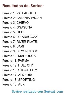 Lista de participantes: SPORTING, HULL CITY, BARI, CATANIA-WIGAN, STOKE CITY, RIVER PLATE, OSASUNA, LILLE, VALLADOLID, R.ZARAGOZA, AEK, PARMA, MALLORCA, ALMERIA, CHIEVO, BIRMINGHAM.