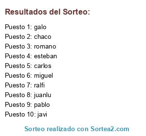 Lista de participantes: carlos, chaco, esteban, galo, javi, juanlu, miguel, pablo, ralfi, romano.
