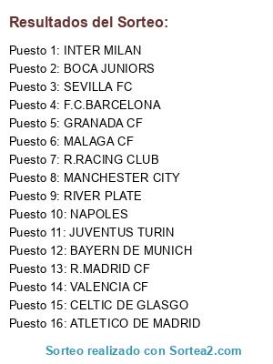 Lista de participantes: SEVILLA FC, R.MADRID CF, NAPOLES, RIVER PLATE, VALENCIA CF, GRANADA CF, MANCHESTER CITY, R.RACING CLUB, MALAGA CF, JUVENTUS TURIN, ATLETICO DE MADRID, INTER MILAN, F.C.BARCELONA, CELTIC DE GLASGO, BOCA JUNIORS, BAYERN DE MUNICH.