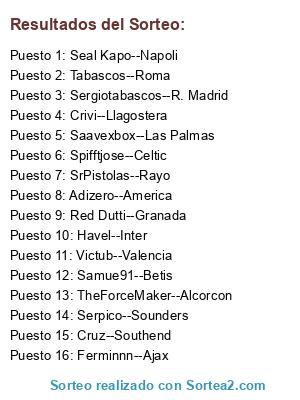 Lista de participantes: Ferminnn--Ajax, Serpico--Sounders, Spifftjose--Celtic, SrPistolas--Rayo, Seal Kapo--Napoli, Havel--Inter, TheForceMaker--Alcorcon, Adizero--America, Tabascos--Roma, Victub--Valencia, Sergiotabascos--R. Madrid, Red Dutti--Granada, Crivi--Llagostera, Samue91--Betis, Saavexbox--Las Palmas, Cruz--Southend.