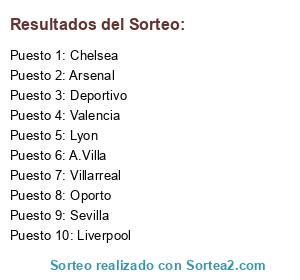 Lista de participantes: Sevilla, Arsenal, Deportivo, Oporto, Lyon, Villarreal, Chelsea, Liverpool, A.Villa, Valencia.