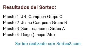 Lista de participantes: San - campeon Grupo A, Jeshu Campeon Grupo B, JR Campeon Grupo C, Diego ( mejor 2do).