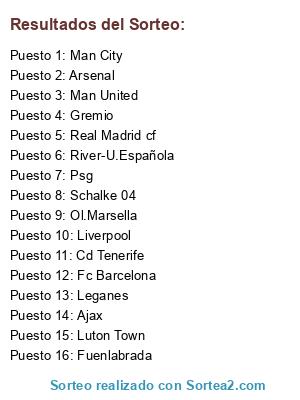 Lista de participantes: Real Madrid cf, Ajax, Psg, Schalke 04, Fuenlabrada, Cd Tenerife, Man City, Luton Town, Ol.Marsella, Arsenal, Man United, Fc Barcelona, Liverpool, River-U.Española, Gremio, Leganes.