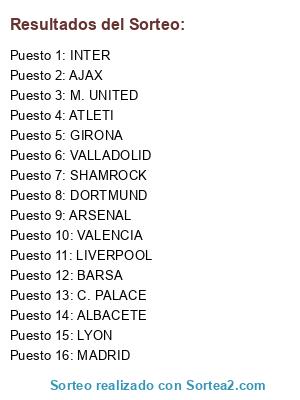 Lista de participantes: ALBACETE, DORTMUND, VALLADOLID, ARSENAL, C. PALACE, M. UNITED, MADRID, ATLETI, AJAX, GIRONA, SHAMROCK, BARSA, INTER, LIVERPOOL, LYON, VALENCIA.