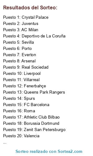 Lista de participantes: Liverpool, Elche, Spurs, Juventus, Manchester City, Everton, AS Roma, Porto FC, Crystal Palace, Sevilla FC, Schalke 04, Real Sociedad, Arsenal, AC Milan, Deportivo de La Coruña, Athletic Club Bilbao, Villarreal, Borussia Dortmund, Bayern München, Valencia, Atlético de Madrid, Fenerbahçe, Galatasaray, Queens Park Rangers, Napoli, Fiorentina, Inter de MIlan, FC Barcelona, RCD Mallorca, Zenit San Petersburgo, Real Madrid, Manchester United.