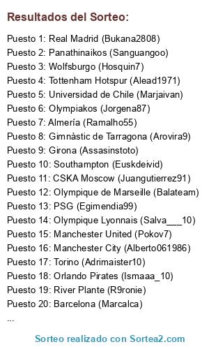 Lista de participantes: CSKA Moscow (Juangutierrez91), Southampton (Euskdeivid), Girona (Assasinstoto), Getafe (Braveitor97), Almería (Ramalho55), Atlético de Madrid (Spain_kiko), Gimnàstic de Tarragona (Arovira9), River Plante (R9ronie), Olympique de Marseille (Balateam), Torino (Adrimaister10), Málaga (Jarmayones), PSG (Egimendia99), Boca Juniors (Isma123i), Shakhtar Donetsk (Pelito10), Liverpool (Pabloggv), Barcelona (Marcalca), Manchester City (Alberto061986), Olympiakos (Jorgena87), Arsenal (Danieliyo10), Real Madrid (Bukana2808), Wolfsburgo (Hosquin7), Universidad de Chile (Marjaivan), Manchester United (Pokov7), Orlando Pirates (Ismaaa_10), Lazio (Alfre-1993), Lugo (Facio7), Real Sociedad (Rubenet1986), Real Zaragoza (DR-11-), Real Betis (Gysan_CLS), Olympique Lyonnais (Salva___10), Tottenham Hotspur (Alead1971), Panathinaikos (Sanguangoo).