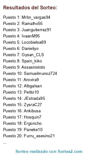 Lista de participantes: CSKA Moscow (Juangutierrez91), Southampton (Euskdeivid), Girona (Assasinstoto), Getafe (Braveitor97), Almería (Ramalho55), Atlético de Madrid (Spain_kiko), Gimnàstic de Tarragona (Arovira9), River Plante (R9ronie), Olympique de Marseille (Balateam), Torino (Adrimaister10), Málaga (Jarmayones), PSG (Egimendia99), Boca Juniors (Isma123i), Shakhtar Donetsk (Pelito10), Liverpool (Pabloggv), Barcelona (Marcalca), Manchester City (Alberto061986), Olympiakos (Jorgena87), Arsenal (Danieliyo10), Real Madrid (Bukana2808), Wolfsburgo (Hosquin7), Universidad de Chile (Marjaivan), Manchester United (Pokov7), Orlando Pirates (Ismaaa_10), Lazio (Kevingr92), Lugo (Facio7), Real Sociedad (AdriC10), Real Zaragoza (Joshu2109), Real Betis (Gysan_CLS), Olympique Lyonnais (Salva___10), AC Milan (Pelizelli), Borussia Dortmund (Alr1979).