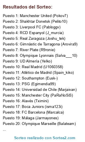 Lista de participantes: Spurs, AC Milan, Juventus, Manchester City, Everton, Porto, AS Roma, Liverpool, Borussia Dortmund, Sevilla, Deportivo de La Coruña, Crystal Palace, Elche, Fenerbahçe, Bayern München, Villarreal, Arsenal, Real Madrid, Barça, Real Sociedad, Manchester United, Atlético de Madrid, Galatasaray, Valencia, Queens Park Rangers, Athletic Club de Bilbao, Napoli, Fiorentina, Inter de Milan, Mallorca, Zenit San Petersburgo, Schalke 04.
