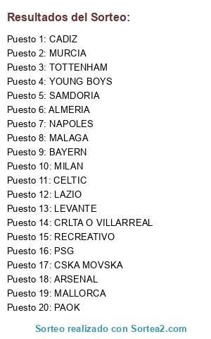 Lista de participantes: LAZIO, SAMDORIA, RECREATIVO, PSG, ALMERIA, TOTTENHAM, LEVANTE, MILAN, MALAGA, BAYERN, MALLORCA, MURCIA, ARSENAL, CADIZ, CSKA MOVSKA, NAPOLES, YOUNG BOYS, PAOK, CELTIC, CRLTA O VILLARREAL.