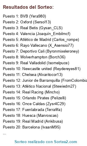 Lista de participantes: Barcelona (IvaanM95), Rayo Vallecano (X_Asensio77), Inter de Milan (Jaunmaalv92), Atlético de Madrid (Carlos_rompe), Valencia (Joaquín_Embilmcf), Real Sporting de Gijón (TheRealBoss10), Real Betis (Gysan_CLS), PSG (isma123i), Sevilla (Yeraiguiu2311), Málaga (Juangutierrez91), BVB (Yera980), Ajax (Sergilujo), Huesca (Manroscas), Real Racing (Mincho), Almeria (Fifsa23), Orlando Pirates (Pelizelli), Atlético Nacional (Stewiedm27), Parma (Peppuz07), Granada (GtGabri89), Wolverhampton (Borch36), Oxford (Sersol13), Tottenham Hotspur (Tanito226), Feyenoord (Jemi666), Newcastle united (Reydereyes81), Once Caldas (Zysr4C29), Real Madrid (Ankibusa), Real Valladolid (Isomelpuce), Chelsea (Alvaritocor13), Fuenlabrada (Terrafifa), Cadiz (Mikic28), Deportivo Cali (Byronmixeleroney), Junior de Barranquilla (FromColombia1969).