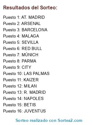 Lista de participantes: MILAN, BARCELONA, ARSENAL, RED BULL, BETIS, LAS PALMAS, KAIZER, PARMA, M. CITY, MALAGA, NAPOLES, R. MADRID, MUNICH, JUVENTUS, SEVILLA, AT. MADRID.