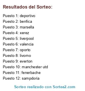 Lista de participantes: liverpool, deportivo, fenerbache, benfica, valencia, oporto, marsella, livorno, xerez, manchester utd, sampdoria, everton.