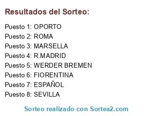Lista de participantes: ROMA, R.MADRID, ESPAÑOL, MARSELLA, SEVILLA, FIORENTINA, OPORTO, WERDER BREMEN.