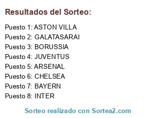 Lista de participantes: INTER DE MILAN, JUVENTUS, ASTON VILLA, ARSENAL, GALATASARAI, BAYER MUNCHEN, BORUSSIA DORTMUND, CHELSEA.