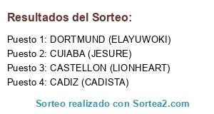 Lista de participantes: CASTELLON (LIONHEART), CADIZ (CADISTA), DORTMUND (ELAYUWOKI), CUIABA (JESURE).