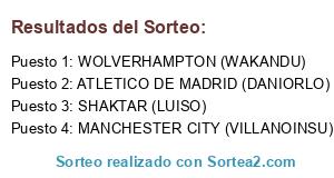 Lista de participantes: ATLETICO DE MADRID (DANIORLO), SHAKTAR (LUISO), MANCHESTER CITY (VILLANOINSU), WOLVERHAMPTON (WAKANDU).