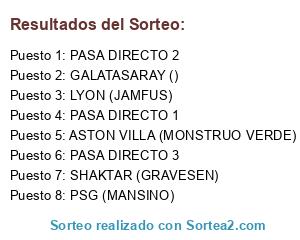 Lista de participantes: PASA DIRECTO 1, LYON (JAMFUS), ASTON VILLA (MONSTRUO VERDE), SHAKTAR (GRAVESEN).